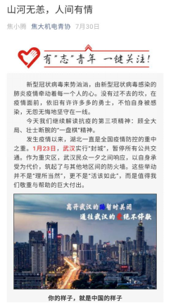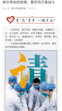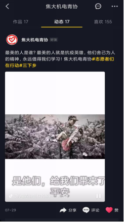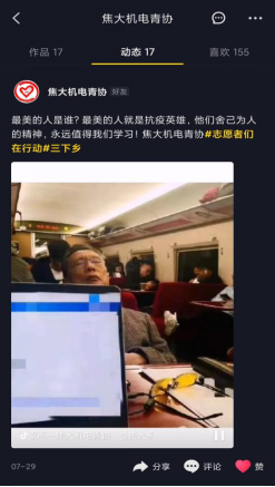在线下宣传的同时,我们还借助网络平台,如焦大机电青协官方抖音,微信公众号,QQ动态等互联网平台积极报道在疫情期间涌现出的人民抗疫英雄,赞扬他(她)们的舍己为人,舍小家为大家的无私奉献精神,发扬万众一心,闻令而动的抗疫精神。