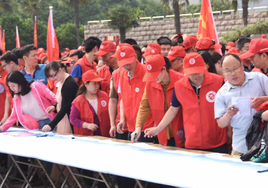 接力签名活动中,文明使者志愿者共同宣誓,并在横幅上接力签名。