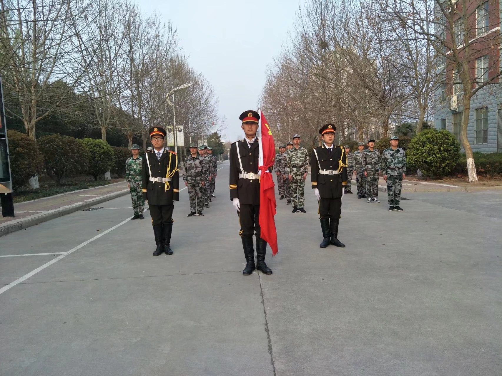 七点三十分左右,升旗仪式正式开始,国旗护卫队成员迈出整齐划一的步伐走向升旗台。随后国旗手走上升旗台做好升旗准备,国旗护卫队护旗成员整齐的站在国旗台两侧。伴随着国歌的奏响,全体师生抬头行注目礼,国歌奏毕,五星红旗升至顶端,全体师生礼毕。