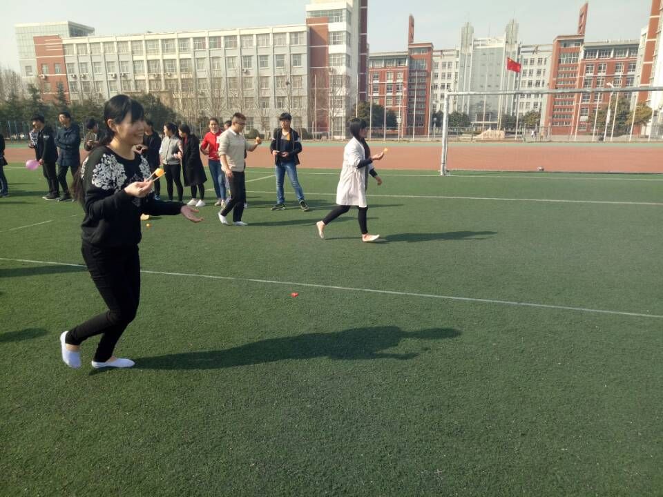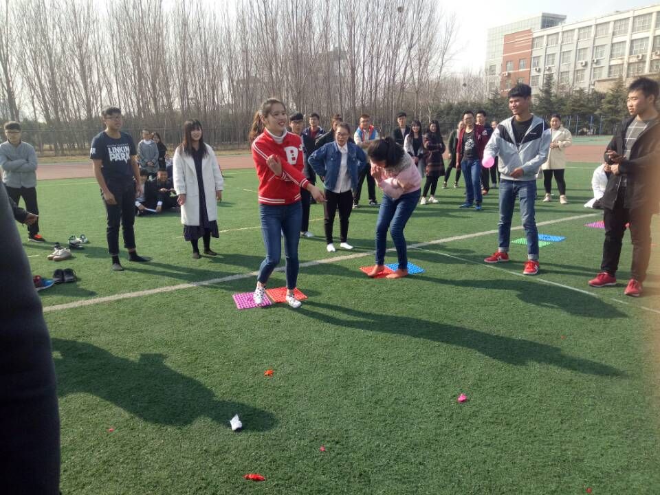 温馨的绿茵毯上,一组组俊男靓女兴高采烈地积极准备着,整个操场都弥漫着欢乐的氛围。游戏内容有趾压板转圈、趣味跳绳、夹乒乓球等,每队之间进行着激烈的PK,“帮扶”、“合作”、“勇敢”、“坚持”、“竞争”这些正能量的词语充斥在现场每处。