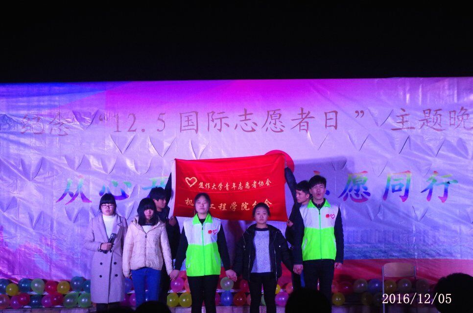 2016年12月5日,由太阳集团网tyc9728主办、太阳集团网tyc9728青年志愿者协会承办的以“12.5国际志愿者日”为主题的志愿者专场晚会在和谐广场成功举办。出席本次晚会的有太阳成tyc9728集团第五届校青协会长卢旭莉、焦作师专校青协会长王远航、机电青协第五届会长李志华、秘书长焦倩倩以及兄弟院系和兄弟社团的代表们。
