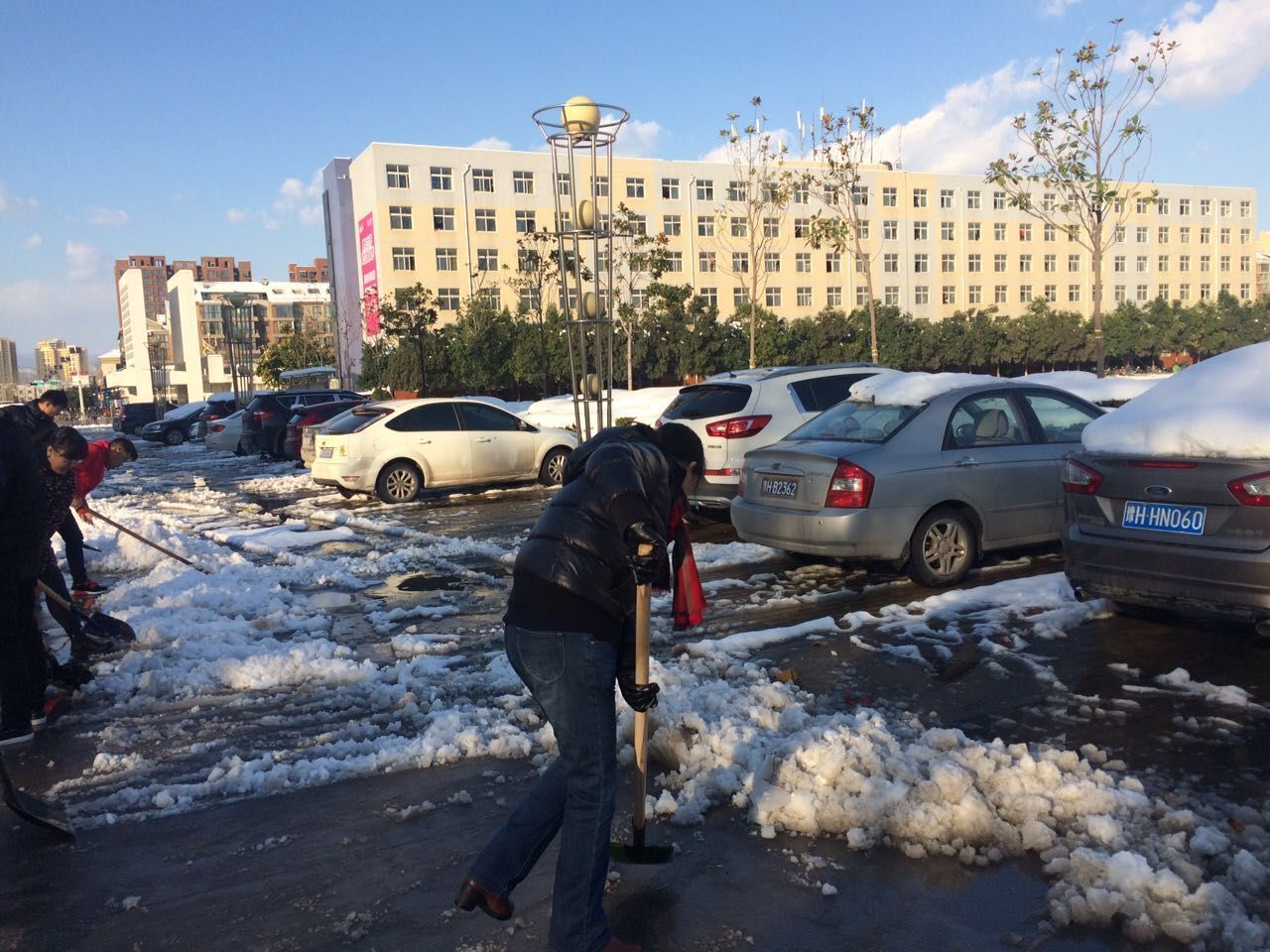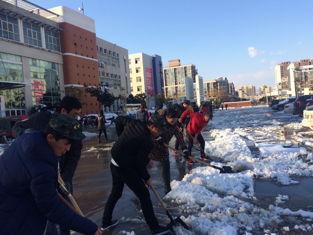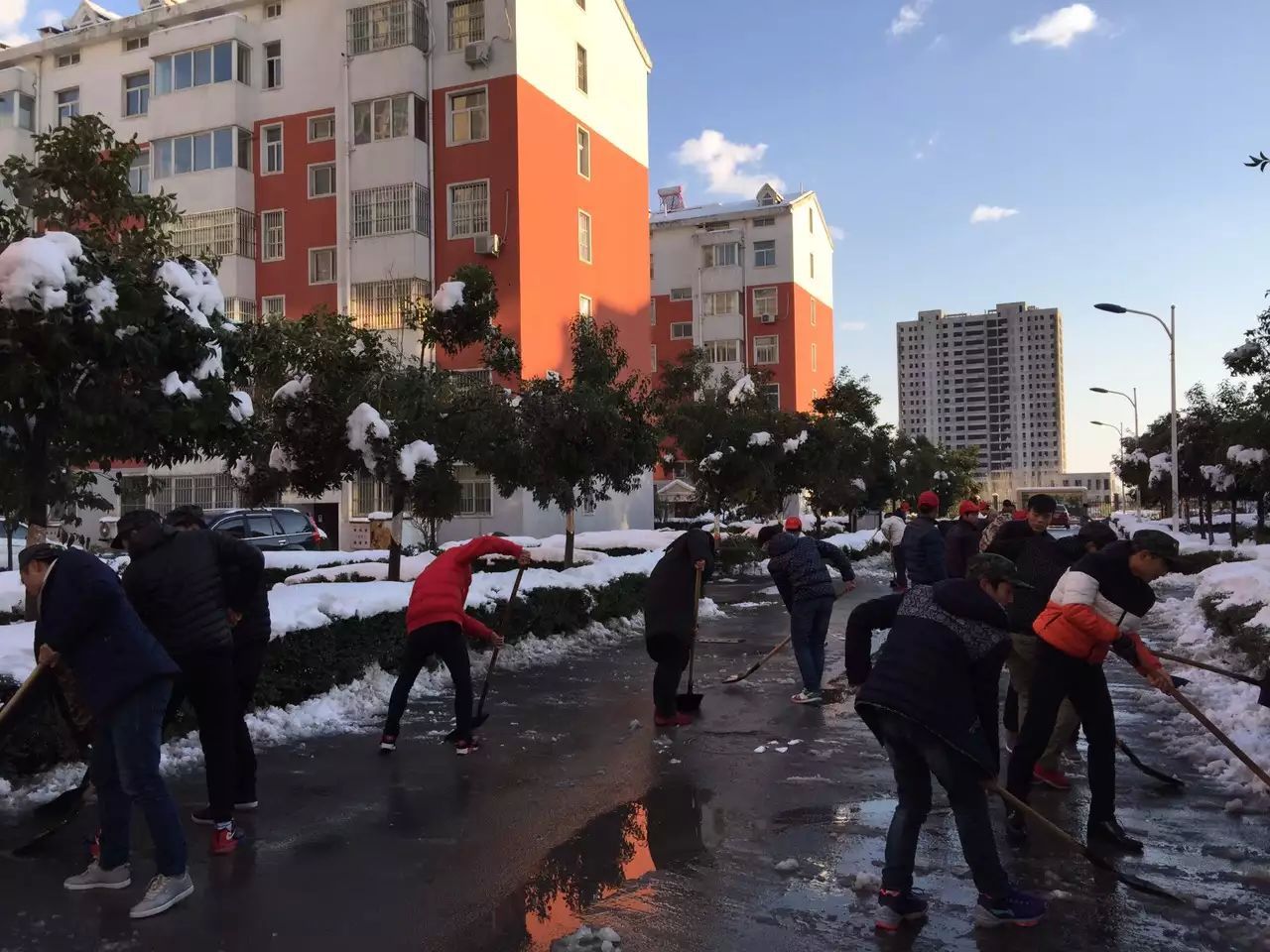 伴随着凛冽的寒风,气温骤降,积雪深度已达20厘米以上,扫雪任务异常艰巨。11月25日下午,在学院党总支李淼书记的带领下,部分教工党员、学生入党积极分子以及青协会员前往一教楼前开始扫雪活动。学校为师生配备了铁锨等工具用来扫雪,大家分工协作,五人一组,三人一队,先用铁锨敲碎道路的结冰,再将积雪和碎冰铲到道路两旁或绿化带中,“咔咔咔”、“嚓嚓嚓”,此刻铲雪的声音成了最动听的音乐。师生们发扬吃苦耐劳、顽强拼搏的战斗精神,不一会儿就将这一片儿的积雪清扫干净。接着,师生们又共赴教授公寓的主干道去清除积雪。虽然室外气温很低,老师和学生们的手、脸都冻得通红,然而这丝毫没有影响到大家的工作效率,师生们劳动的热情和团结的力量让这个冬日变得格外温暖。