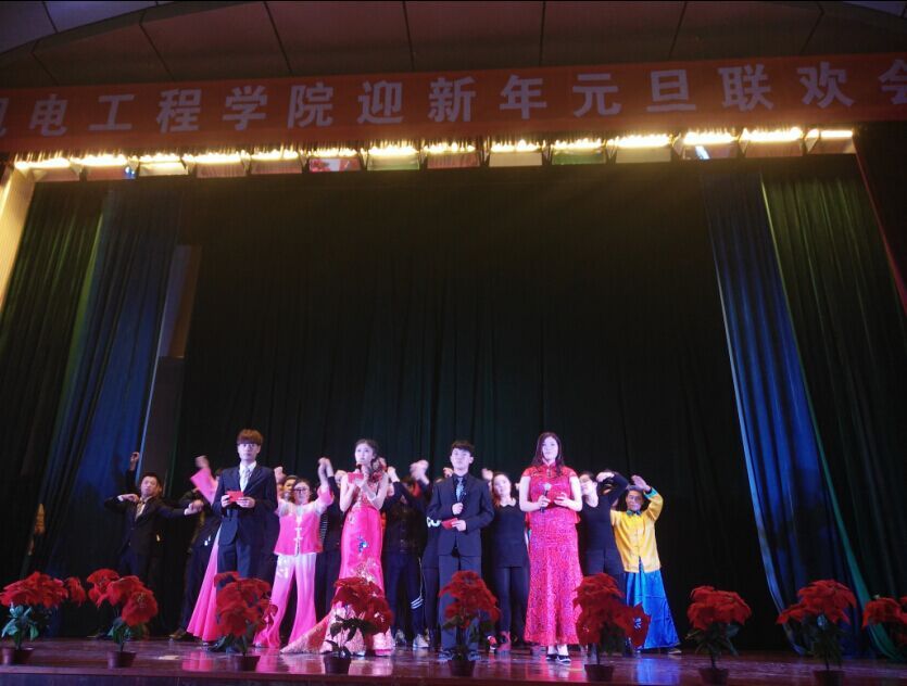 联欢会在现代舞《good boy》的表演中拉开序幕,每一个节目都从不同方面展示了我院学子的青春活力和魅力。歌曲《曹操》、《奔跑》等轮番登场,或浪漫温馨,或轻快悠扬,或活泼动感,风格各异,变幻多姿;我院学生会的同学们自编自演的小品《满腹经纶》、方言版《向领导汇报》、相声《我是歌手》、《追女生》等用惟妙惟肖的表演、别出心裁的服装和令人捧腹的角色反串,引得观众爆笑连连;热舞《say my name》、《day by day》等用动感的舞步和帅气的肢体语言展示了同学们活泼阳光的青春风采和充满自信的机电豪情。整场演出形式多样,动静结合,趣味十足,高潮不断,为现场的观众们献上了一场美妙绝伦的视听盛宴。同时,也充分展示了我院大学生朝气蓬勃的精神风貌及力争上游的决心勇气。最后,在全体演员合唱《相亲相爱》的歌声中,我院的元旦联欢会完美落幕。