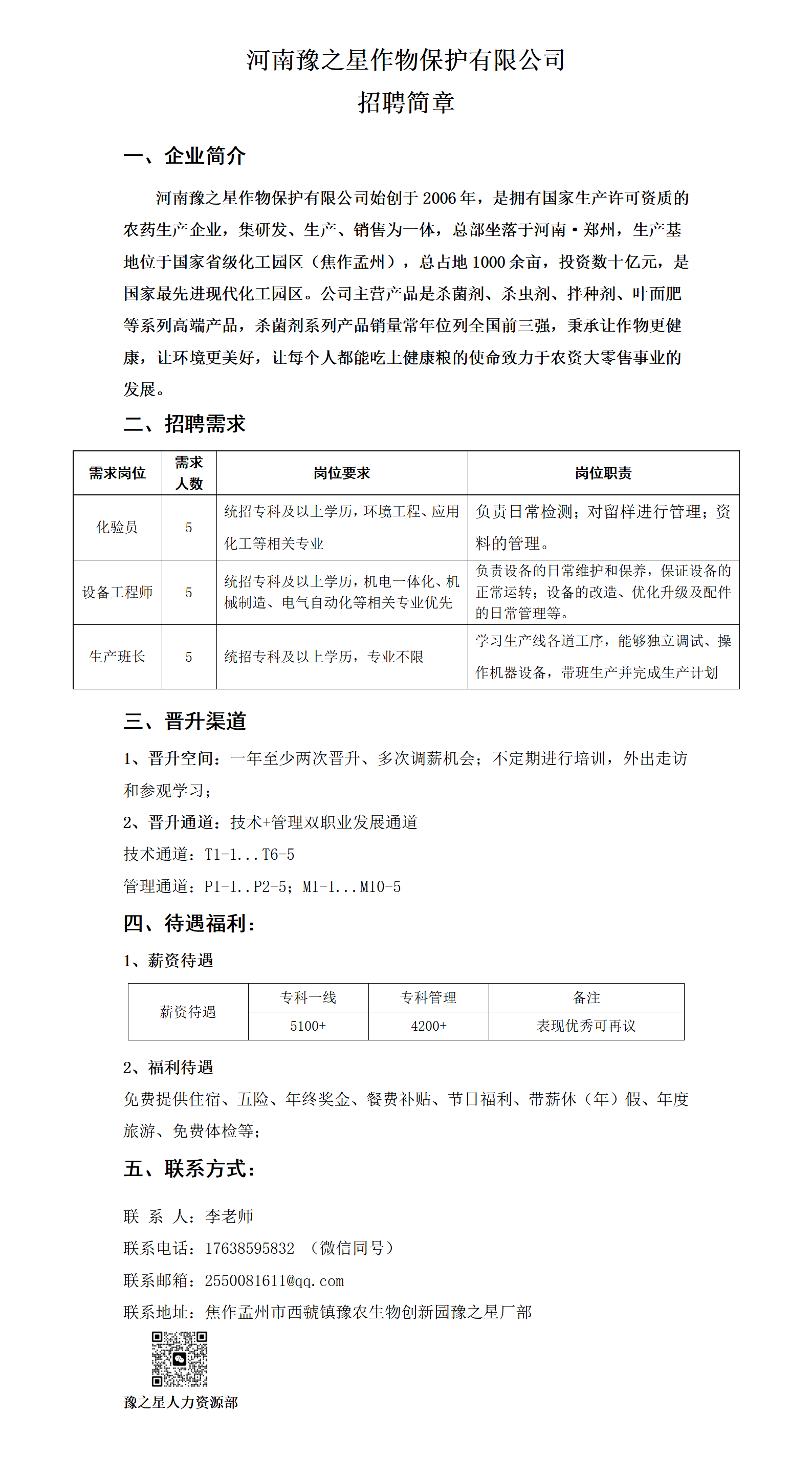 河南豫之星作物保护有限公司招聘简章